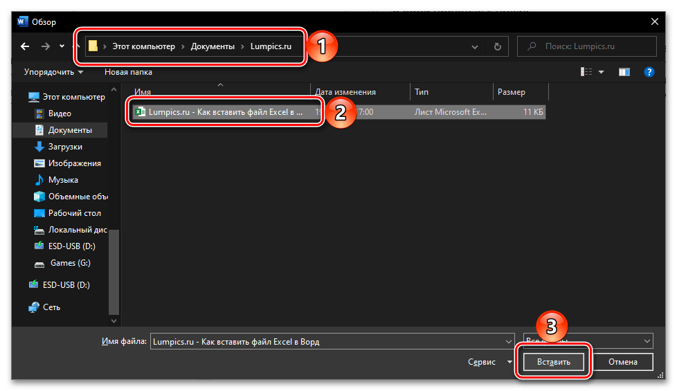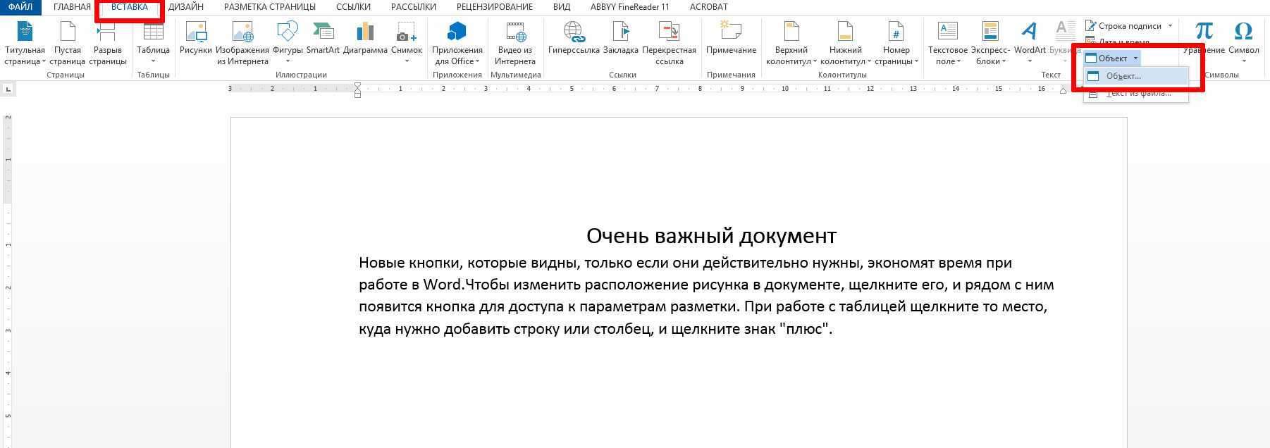 Оба предложенных выше решения работают только с локальными файлами, используемыми на конкретном ПК, то есть если вы передадите документ Word с внедренной в него таким образом таблицей Excel, открыть ее не получится по причине фактического отсутствия самого файла. Для того чтобы такая возможность стала доступной, книгу нужно добавлять в виде объекта. Делается это следующим образом: