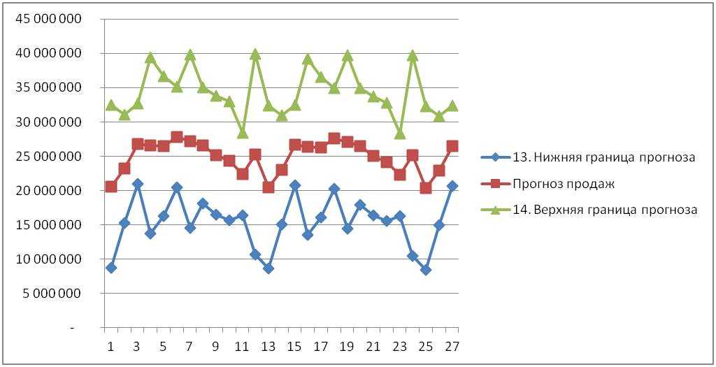 - Нижняя граница прогноза — прогноз продаж с учетом роста и сезонности – (минус) 3 сигма;