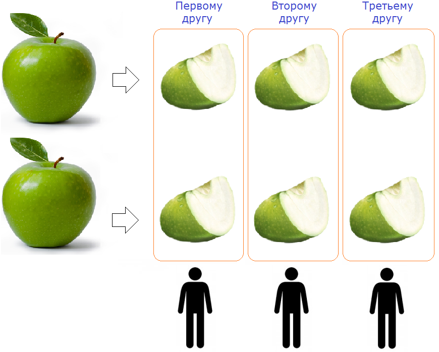 Итак, две дольки яблока из пяти составляют две пятых.