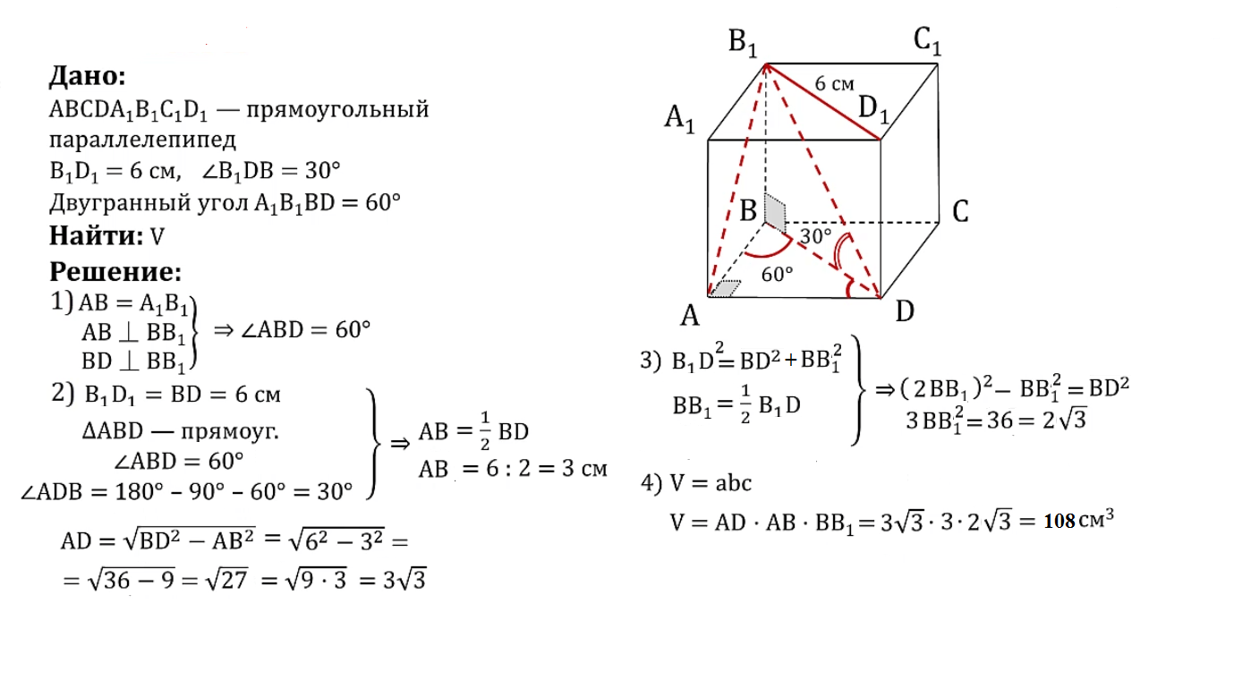 Исходя из первого свойства параллелепипедов AB = A1B1, а грань B1D1 = BD. Согласно следствиям из теоремы Пифагора сумма всех углов в прямоугольном треугольнике равна 180°, а катет, лежащий против угла в 30°, равен гипотенузы. Применив данные знания для треугольника, легко находим длину сторон AB и AD. Затем перемножаем полученные значения и вычисляем объем параллелепипеда.