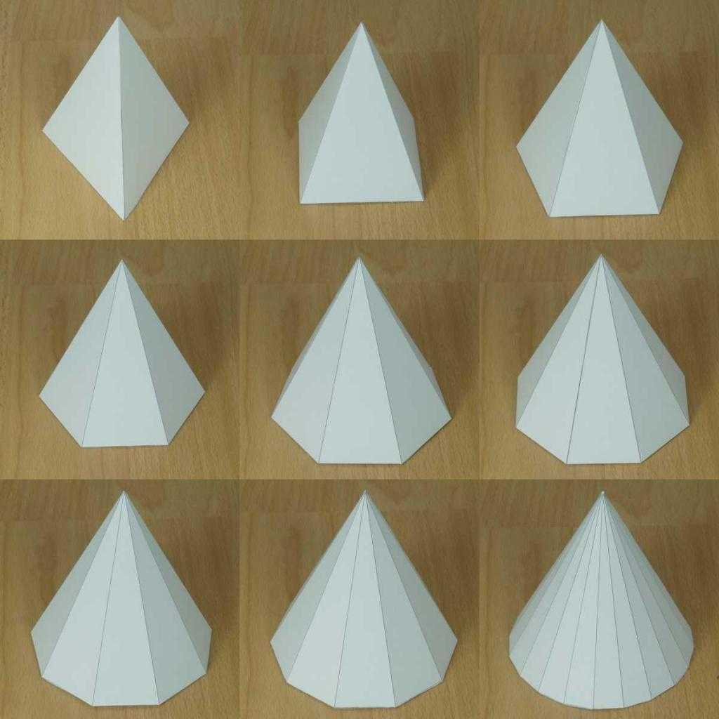 Эта фотография позволяет сделать некоторые выводы, касающиеся пирамид. Во-первых, стороны, которые соединяют n-угольник с вершиной фигуры, представляют собой треугольники. Во-вторых, количество сторон любой пирамиды равно n+1 (один n-угольник и n треугольников), n-угольник называют основанием, а треугольники — боковыми гранями. В-третьих, можно заметить, что увеличение сторон основания приближает пирамиду по своей форме к конусу. Этот факт позволяет считать конус пирамидой с бесконечным числом боковых граней.