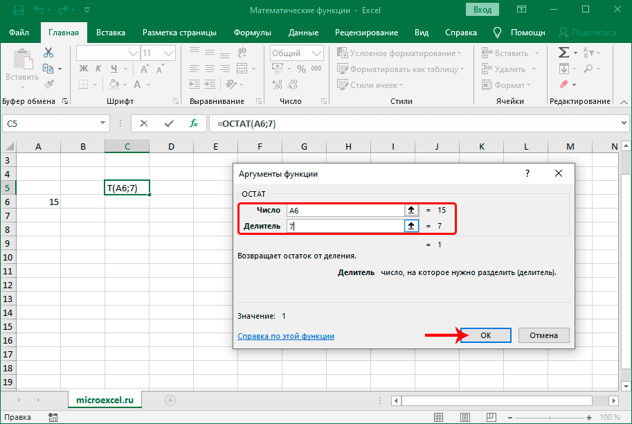 Для того, чтобы получить результат, требуется заполнить значения двух аргументов: Число и Делитель.