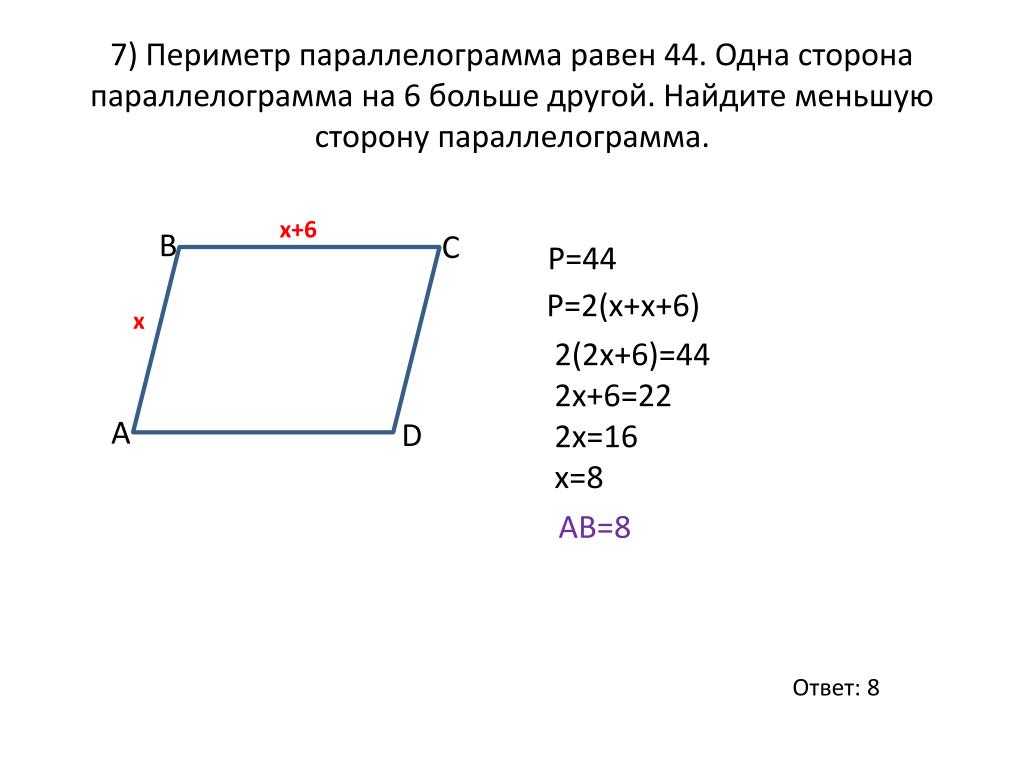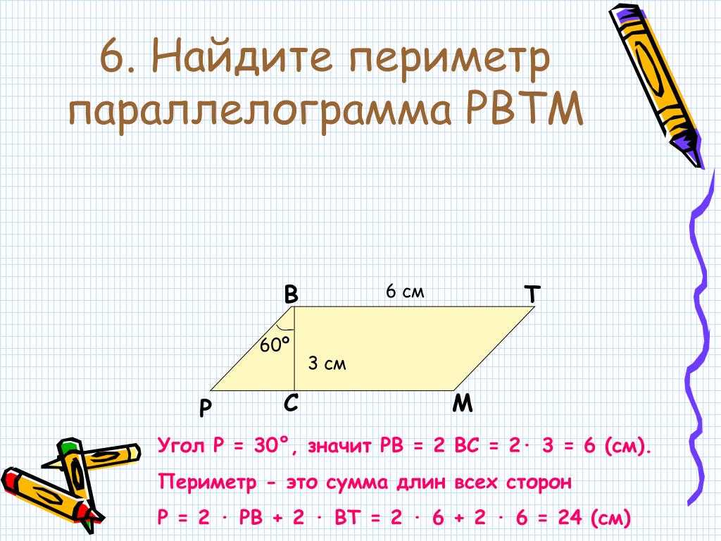 Давайте попробуем решить пример, чтобы лучше понять, как периметр формулы параллелограмма применяется к математическим задачам 8 класса и работает в режиме реального времени.