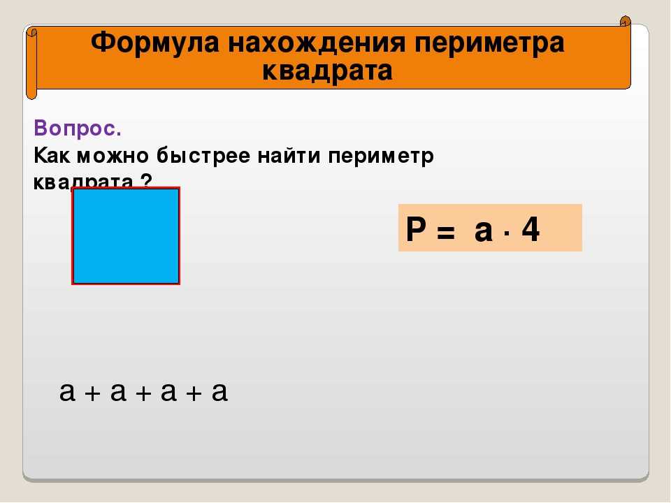 В случае с квадратом, который, напомним, является частным случаем прямоугольника, посчитать периметр еще проще. Благодаря тому, что у него все стороны равны (назовем их условно «а»), формула выглядит так: