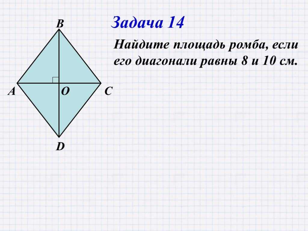 Решение:Воспользовавшись формулой, в которой задействованы длины диагоналей, получаем: