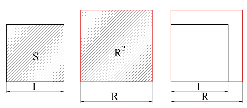 Далее построим два квадрата, стороны которых имеют длины I и R, и совместим их друг с другом: