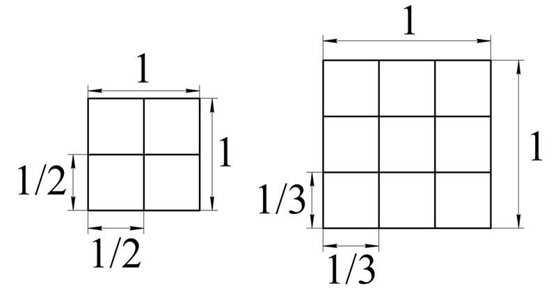 Но что делать в случае, если сторона квадрата – это не целое, а дробное число? Пусть оно равно некоторой дроби 1/m, например, 1/2 или 1/3. Тогда поступим наоборот – разделим сам единичный квадрат на несколько частей. Получится почти такая же картина: