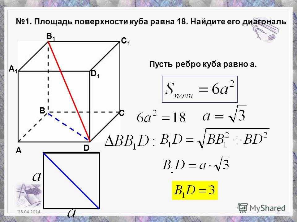 Площадь поверхности куба = 6a 2 , где a — длина стороны каждого ребра куба. Иными словами, поскольку все стороны куба равны, а — это просто длина одной стороны куба.