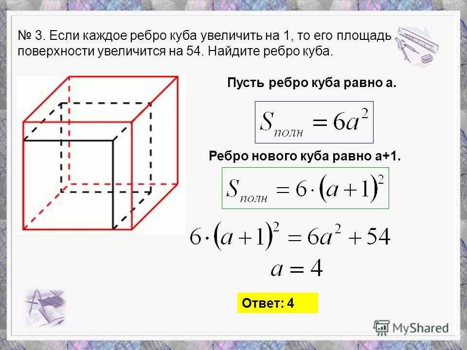 Таким образом, чтобы найти площадь куба, нужно найти длину стороны квадрата, а для этого необходимо извлечь кубический корень из объема куба. Формула для этого: a = V^(1/3), где V — объем куба.