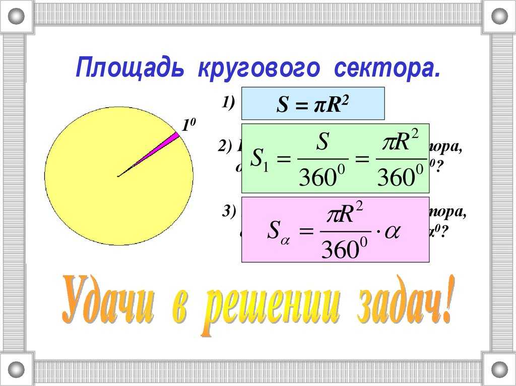 Сектор является частью круга, а его площадь относится к площади круга так же, как и длина окружности сектора к длине всей окружности. Поэтому площадь сектора равна площади круга, умноженной на отношение длинны окружности сектора к длине окружности всего круга.