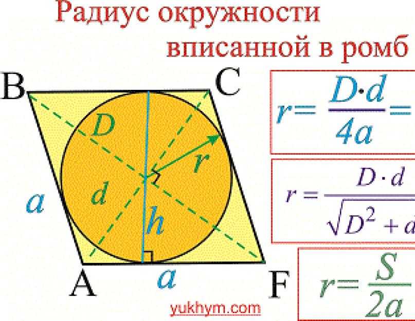 Формула нахождения радиуса окружности, вписанной в ромб через значения диагоналей: