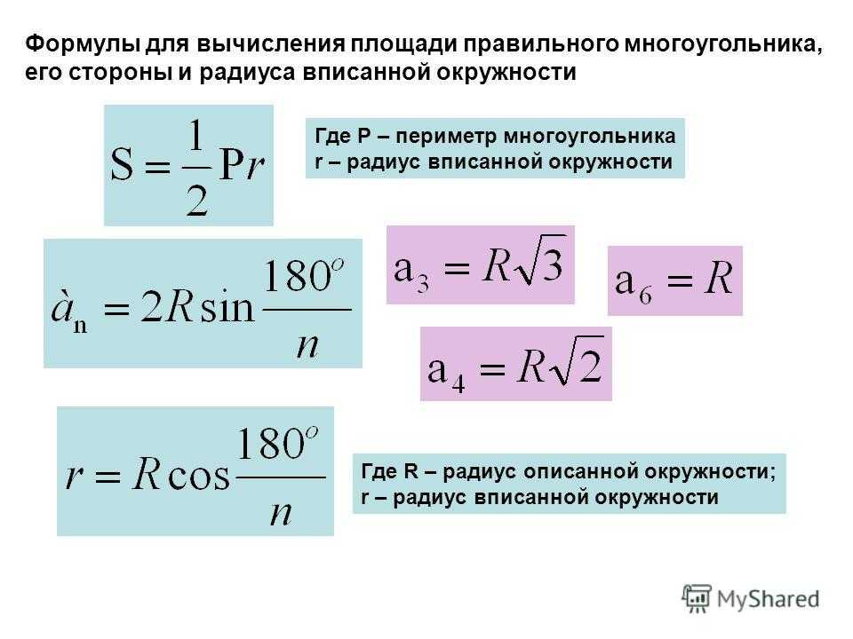 Формула нахождения радиуса окружности, вписанной в правильный многоугольник: