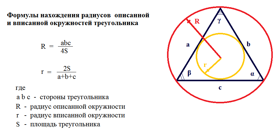 Таким образом, для определения радиуса окружности, которая описана около треугольника, требуется произведение длины сторон этой геометрической фигуры разделить на четыре площади треугольника.