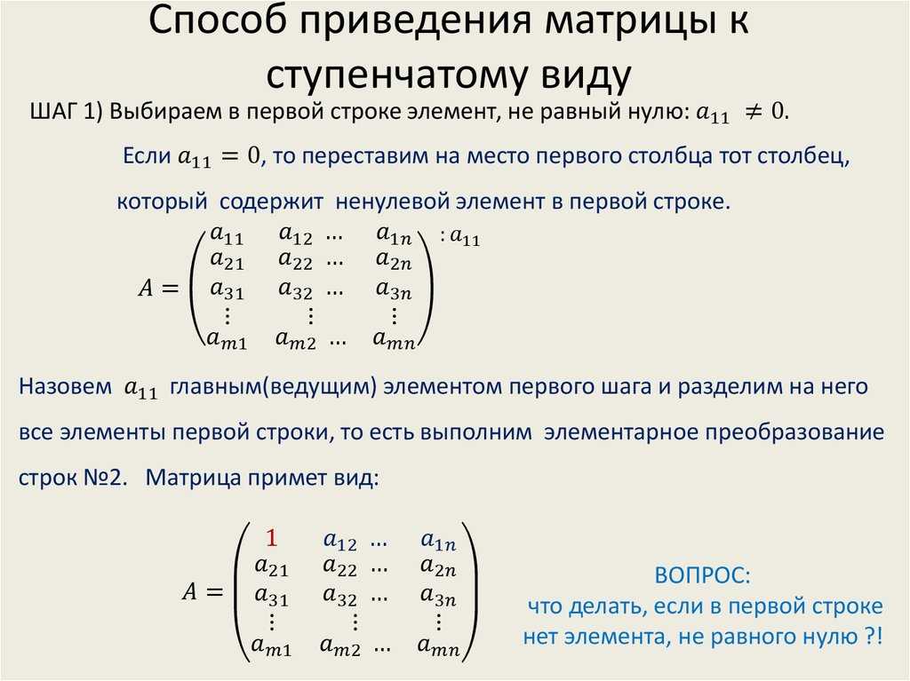Теперь будем рассматривать полные строки. Вычтем из последней строки линейную комбинацию предыдущих с теми же коэффициентами \alpha_{1},…, \alpha_{r-1}. Это обратит в нуль j_{1},…, j_{r-1}-й элементы r-й строки, но не всю строку, так как строки линейно независимы. Таким образом, в преобразованной r-й строке есть ненулевой элемент a_{j}^{r}, и его номер j отличен от номеров j_{1},…, j_{r-1}.