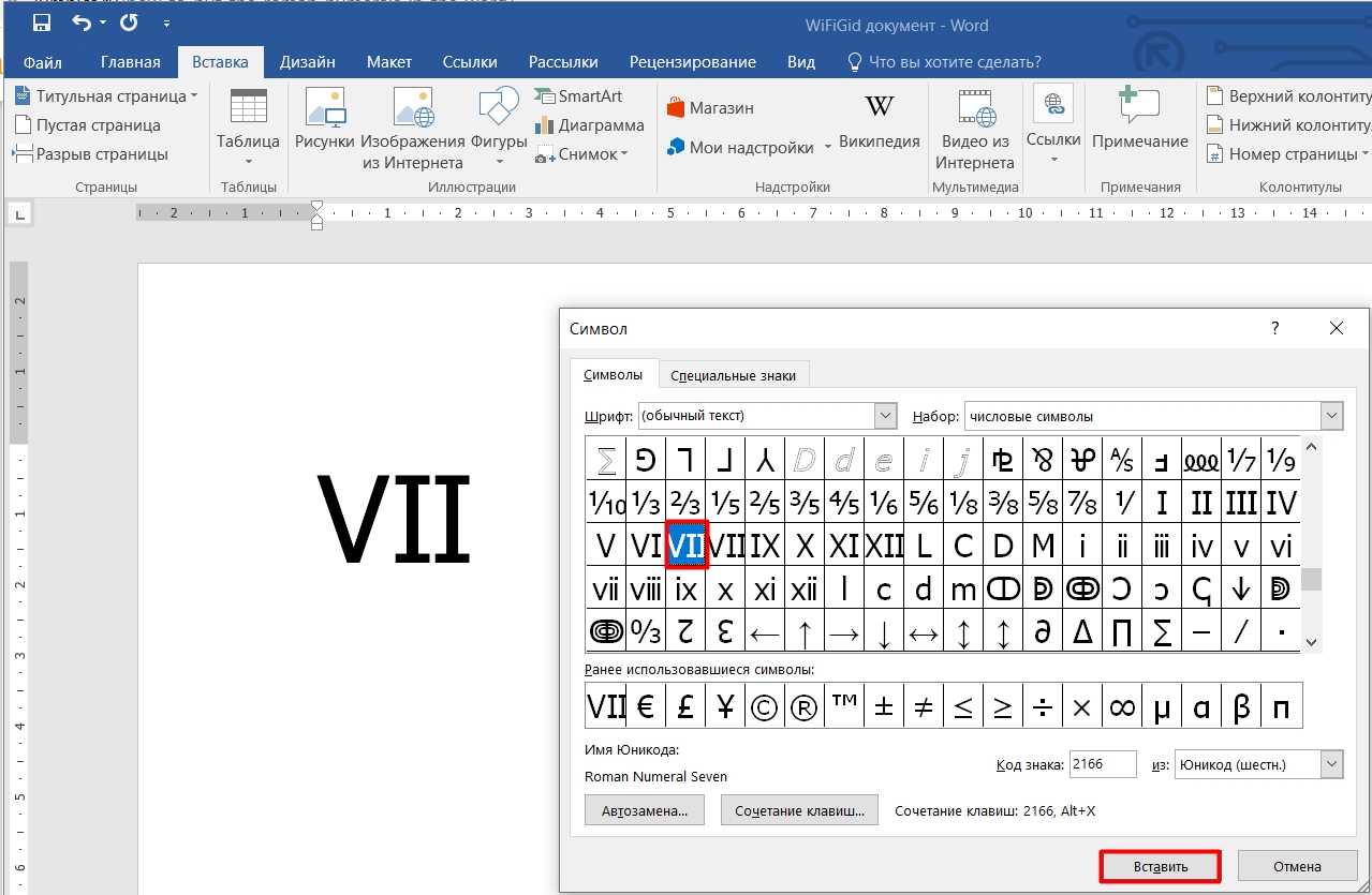 Например, вставим цифру 7 (VII); просто выделите этот знак и нажмите «Вставить».