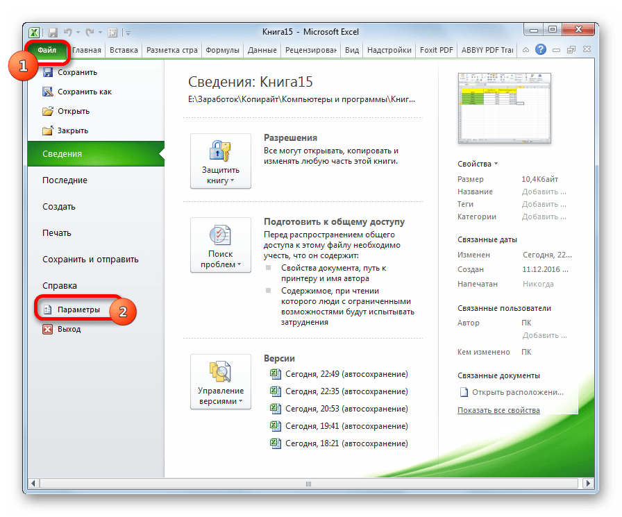 - Открываем вкладку «Файл». Далее перемещаемся в подраздел «Параметры».
