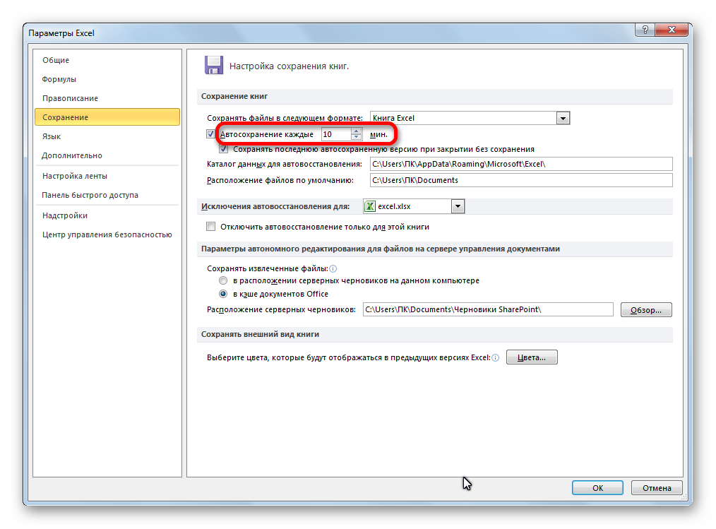 В разделе «Сохранение книг», нужно поставить галочкой в пункт «Автосохранение». И укажите интервал периодичности автоматического сохранения документов.