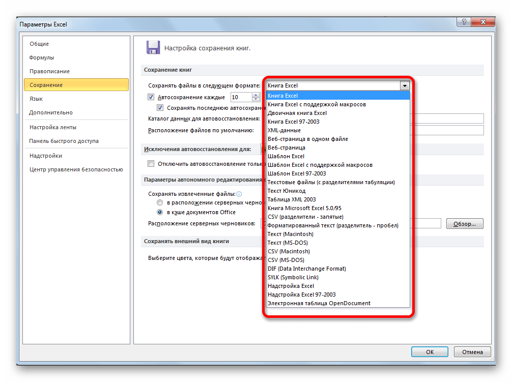 Кроме того, в разделе настроек можно изменить ещё ряд других параметров, хотя без лишней надобности их не советуют трогать. Прежде всего, можно определить в каком формате файлы будут сберегаться по умолчанию. Это делается путем выбора соответствующего наименования формата в поле параметра «Сохранять файлы в следующем формате». По умолчанию это Книга Excel (xlsx), но имеется возможность смены этого расширения на следующие: