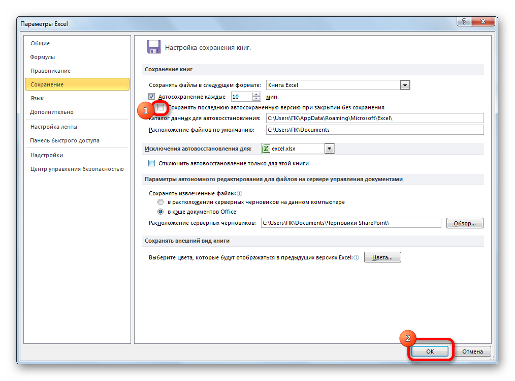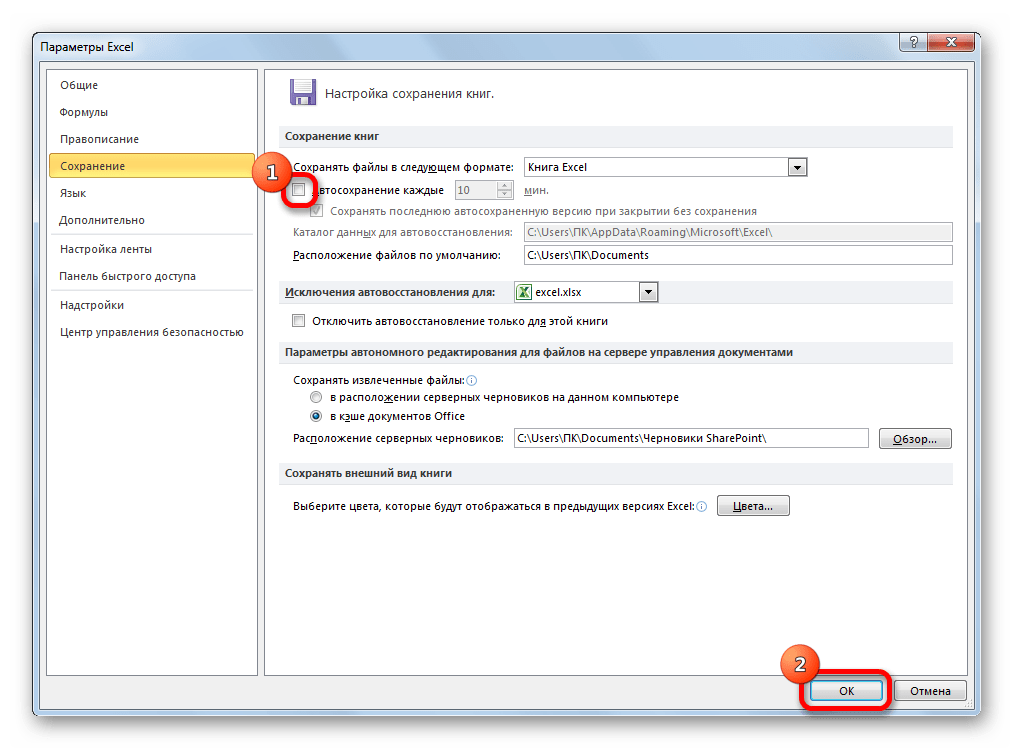 Как уже было сказано выше, автоматическое сохранение копий фалов Excel можно отключить. Для этого достаточно снять галочку с пункта «Автосохранение каждые» и нажать на кнопку «OK».
