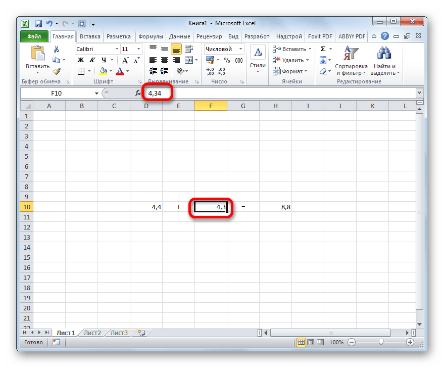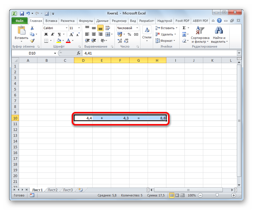 Это как раз связано с тем, что реально для расчета Эксель продолжает брать числа 4,41 и 4,34. После проведения вычисления получается результат 4,75. Но, так как мы задали в форматировании отображение чисел только с одним десятичным знаком, то производится округление и в ячейку выводится число 4,8. Поэтому создается видимость того, что программа допустила ошибку (хотя это и не так). Но на распечатанном листе такое выражение 4,4+4,3=8,8 будет ошибкой. Поэтому в данном случае вполне рациональным выходом будет включить настройку точности как на экране. Тогда Эксель будет производить расчет не учитывая те числа, которые программа держит в памяти, а согласно отображаемым в ячейке значениям.