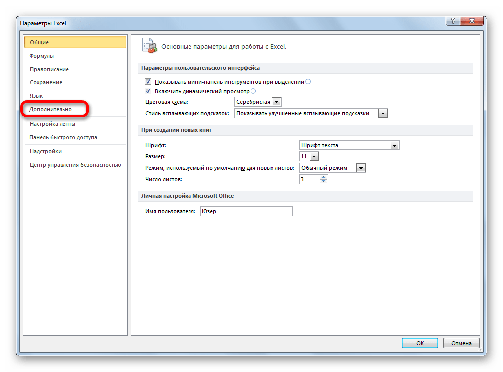 Запускается дополнительное окно параметров. Перемещаемся в нем в раздел «Дополнительно», наименование которого значится в перечне в левой части окна.