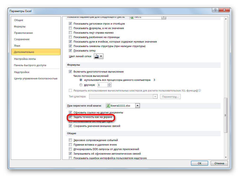 - В открывшемся окне выбираем пункт «Дополнительно». В правой части окна в группе настроек «При пересчете этой книги» устанавливаем галочку около параметра «Задать точность как на экране».