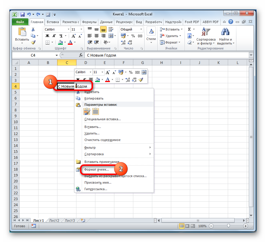 - Выделяем ячейку, в которой текст выходит за пределы границ. Кликаем по ней правой кнопкой мыши. В открывшемся списке выбираем пункт «Формат ячеек…».