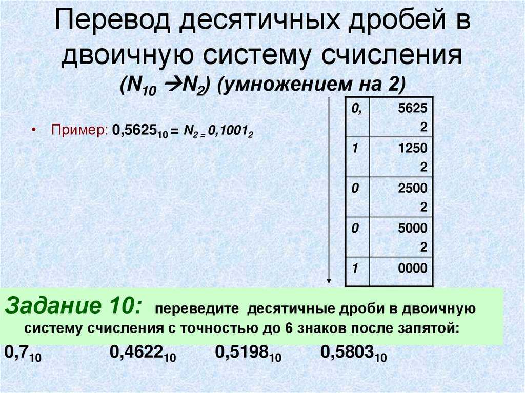 Число 1,375 пришлось три раза умножать на 10, что уже не очень удобно, а что нам придется делать в случае, если понадобится преобразовать число 0,000625? В этой ситуации используем следующий способ преобразования дробей.