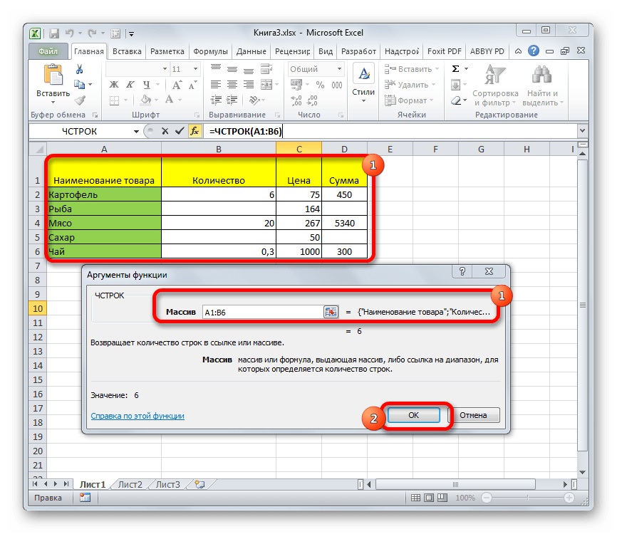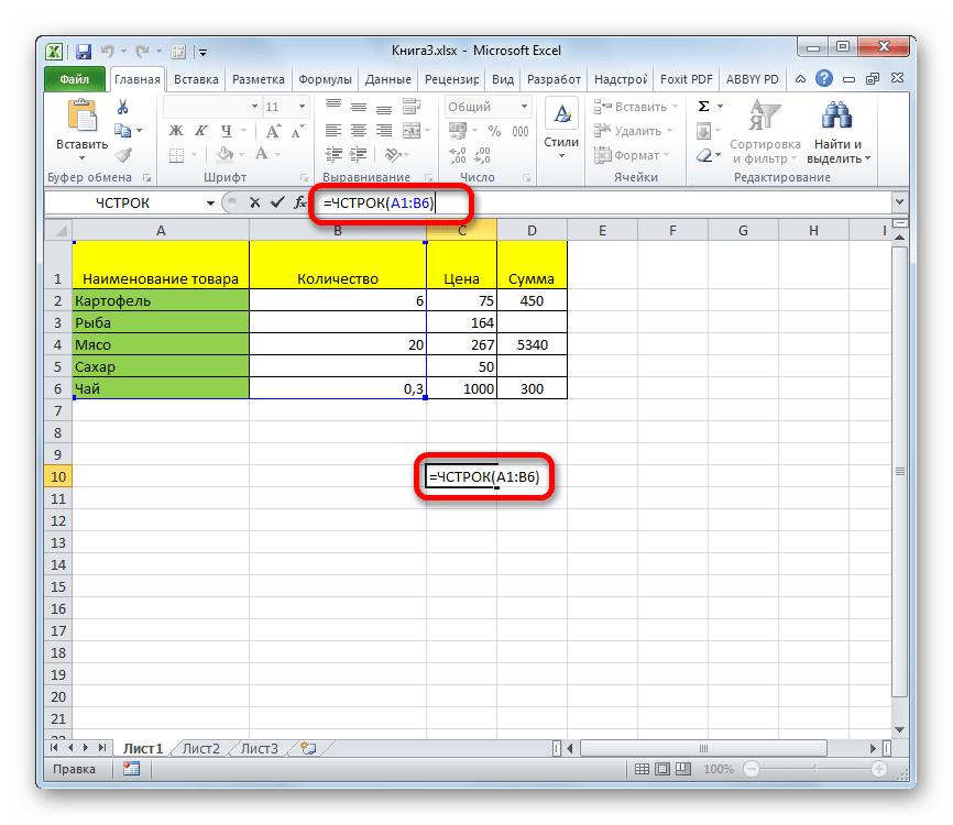 Если первый метод позволяет оперативно посмотреть количество строк путем подсчета заполненных ячеек, то описываемый в этом разделе способ поможет зафиксировать результаты подсчета в виде конкретного значения в свободной ячейке листа. Причем в результат будут включаться все строки – и пустые и с введенными данными. Речь идет о встроенной функции ЧСТРОК, которая позволит реализовать эту задачу.