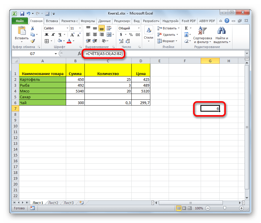 Следующий метод подсчета ячеек с данными основан на использовании функции СЧЁТЗ. Принцип ее работы полностью эквивалентен счетчику строки состояния, но использование функции дает возможность закрепить полученный результат в определенной ячейке таблицы