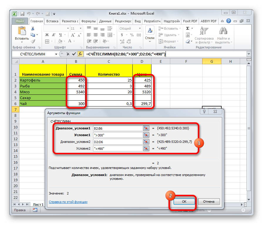 - ;… — пара последующих аргументов рассматриваемой функции, смысл которых соответствует аргументам диапазон_условия1 и условие1 соответственно. Всего может быть указано до 127 диапазонов и условий для отбора значений.