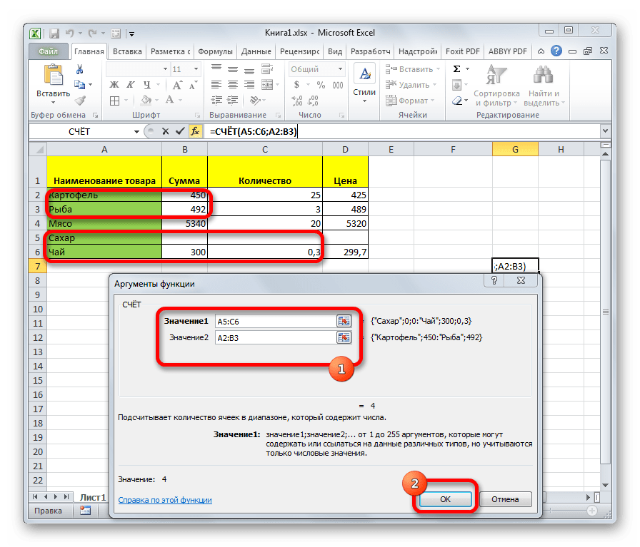 - если нужно посчитать количество ячеек с данными из другого (не пересекающегося с первым) диапазона, то ставим курсор в поле “Значение2” и выделяем следующий диапазон ячеек. В нашем случае, диапазоны находятся рядом, и мы просто демонстрируем возможность выполнения такого действия;