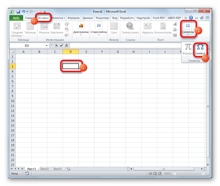 - Выделяем ячейку, куда должен быть вписан знак. Переходим во вкладку «Вставка». На ленте в блоке инструментов «Символы» жмем на кнопку с наименованием «Символ».
