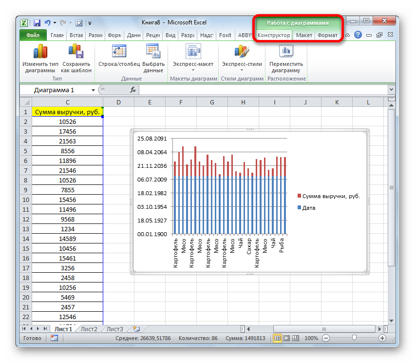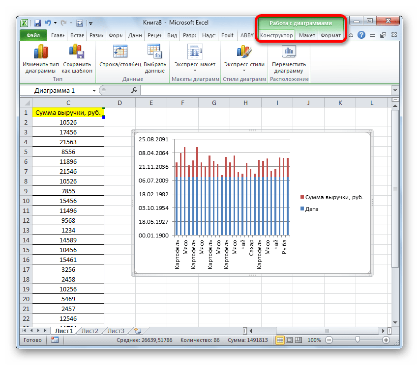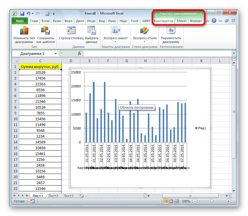 С помощью инструментов, расположенных в группе вкладок «Работа с диаграммами» можно редактировать полученный объект: