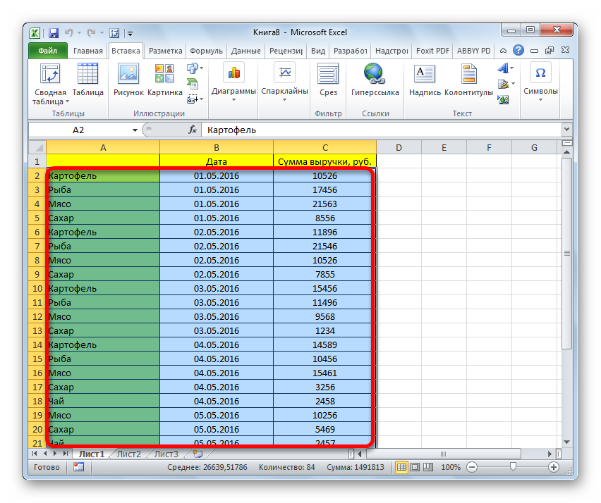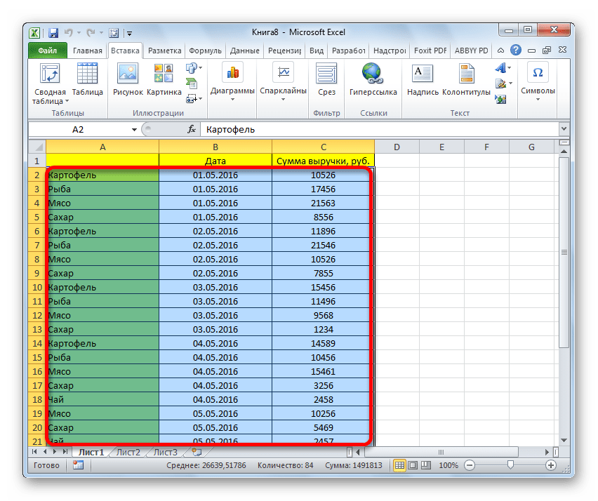 - Строим таблицу, в которой содержатся данные, отображаемые в будущей диаграмме. Выделяем мышкой те столбцы таблицы, которые будут отображены на осях гистограммы.