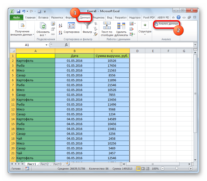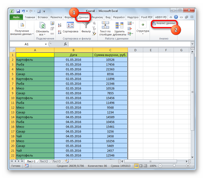 Перемещаемся во вкладку «Данные». Жмем на кнопку, расположенную на ленте «Анализ данных».