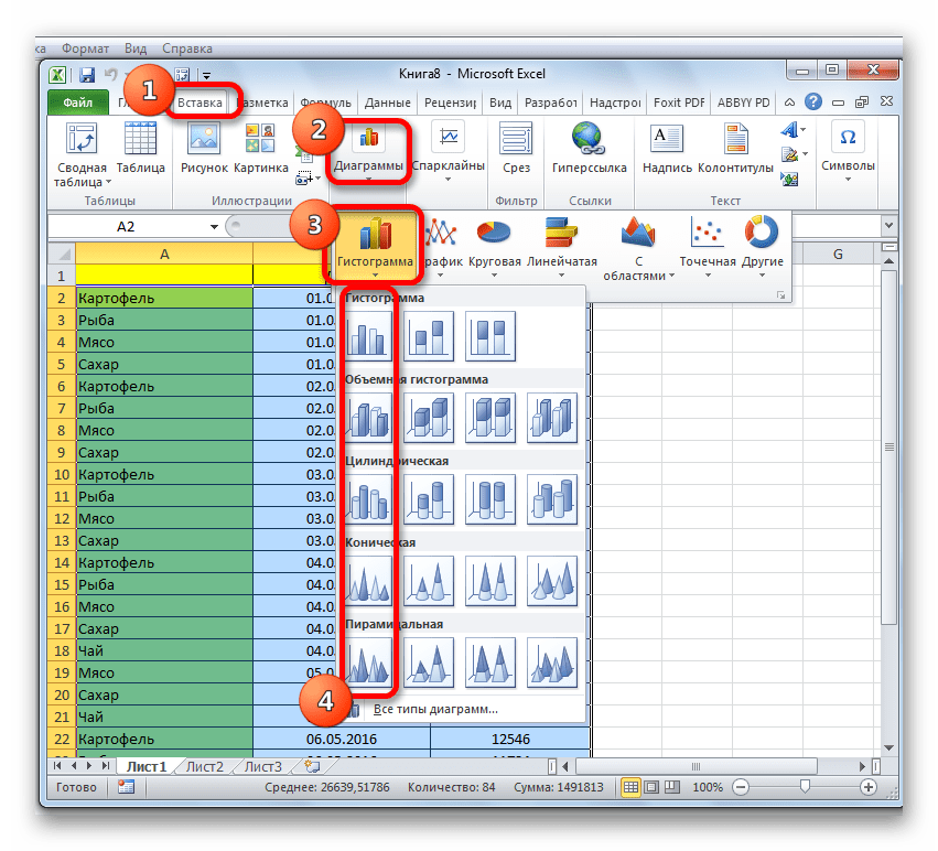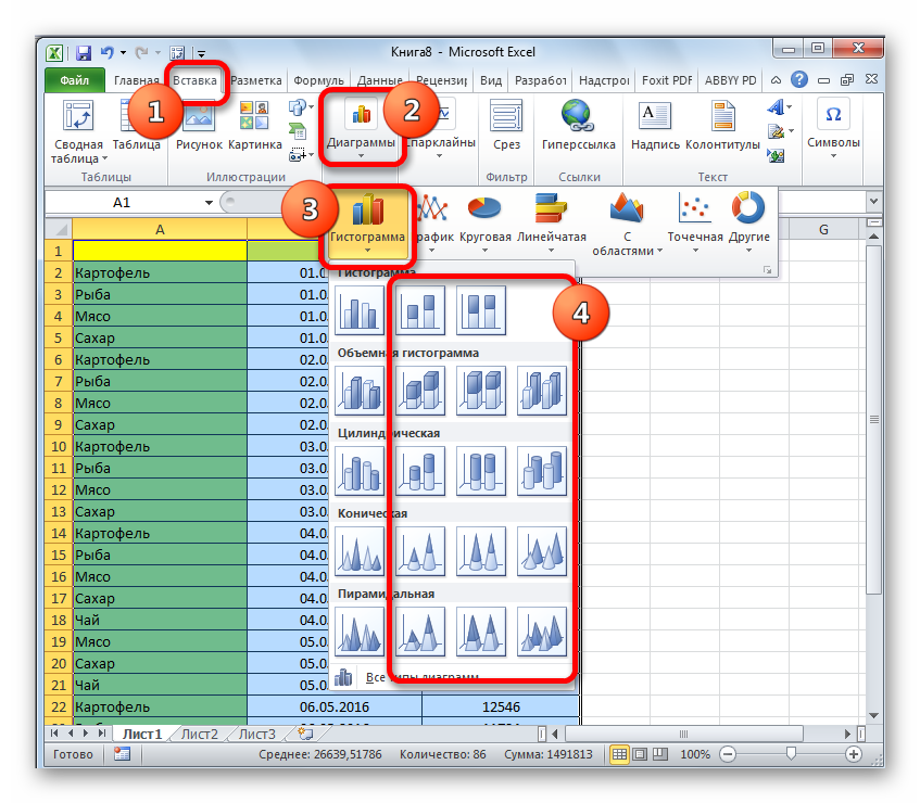 Excel 2010 и Excel 2007: на вкладке Вставка щелкните значок Гистограмма, а затем выберите нужный тип гистограммы.
