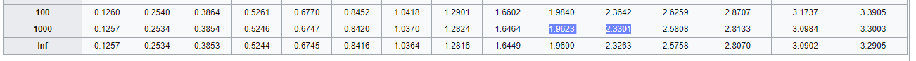 Воспользуемся теперь таблицей коэффициентов Стьюдента из Википедии, найдя строку, соответствующую нашим 449 степеням свободы.