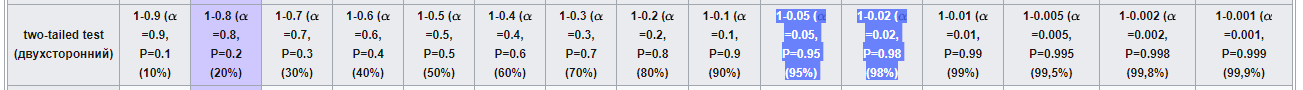 В шапке таблицы это соответствует 95%-му и 98%-му квантилю распределения Стьюдента, т. е. мы захватили 95%-й квантиль, но не захватили 98%-й: