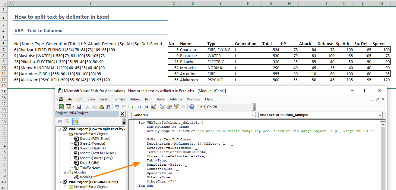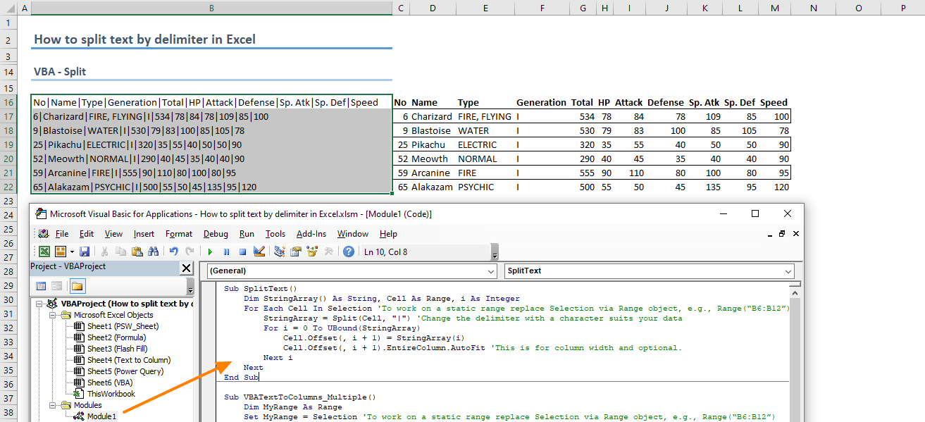 Как разбить ячейки с помощью разделителей.