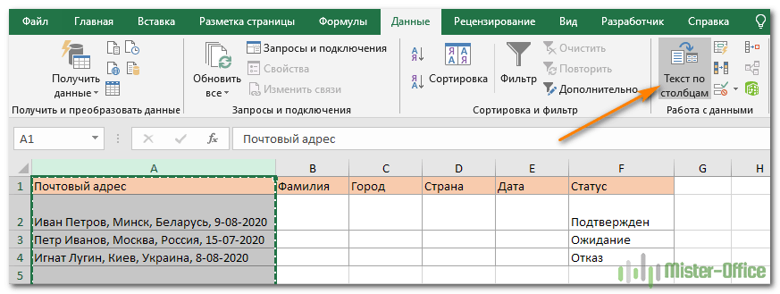 Мы хотим разделить данные в одной ячейке на несколько: имя, фамилия, город, страна и дата. Для этого выполните следующие действия: