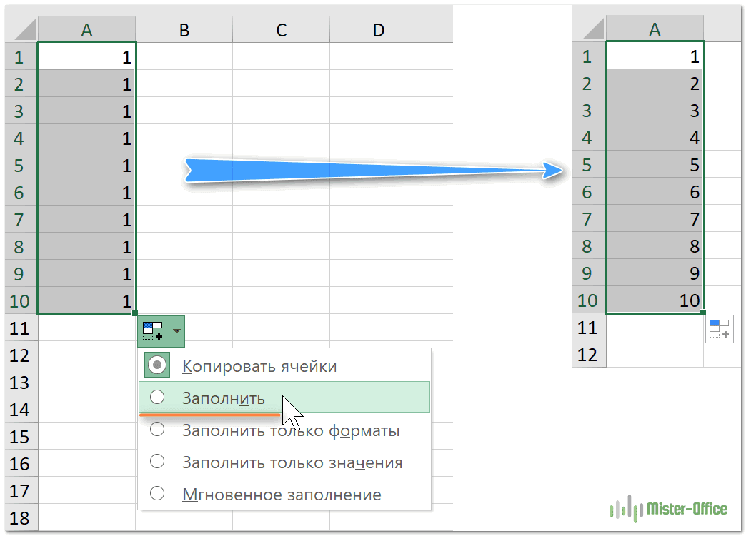 В результате, во всех ячейках получаем цифру 1. После этого щелкаем на появившийся значок справа от заполненного диапазона и в предложенном списке выбираем команду “Заполнить”.