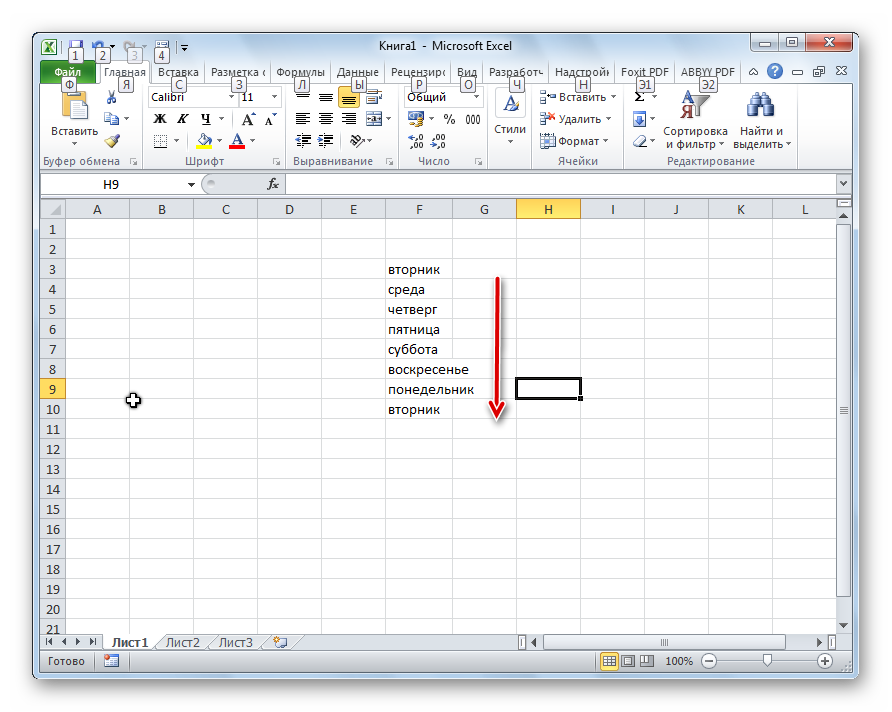 Точно так же, можно произвести автозаполнение по дням недели (понедельник, вторник, среда…) или по месяцам (январь, февраль, март…).