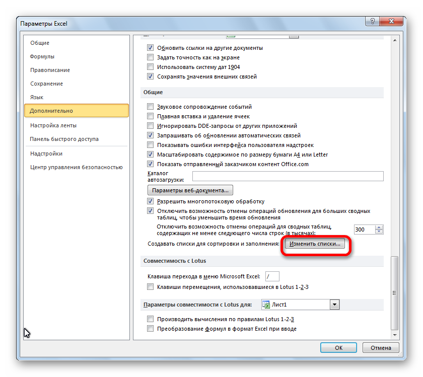 В блоке настроек «Общие» в центральной части окна жмем на кнопку «Изменить списки…».