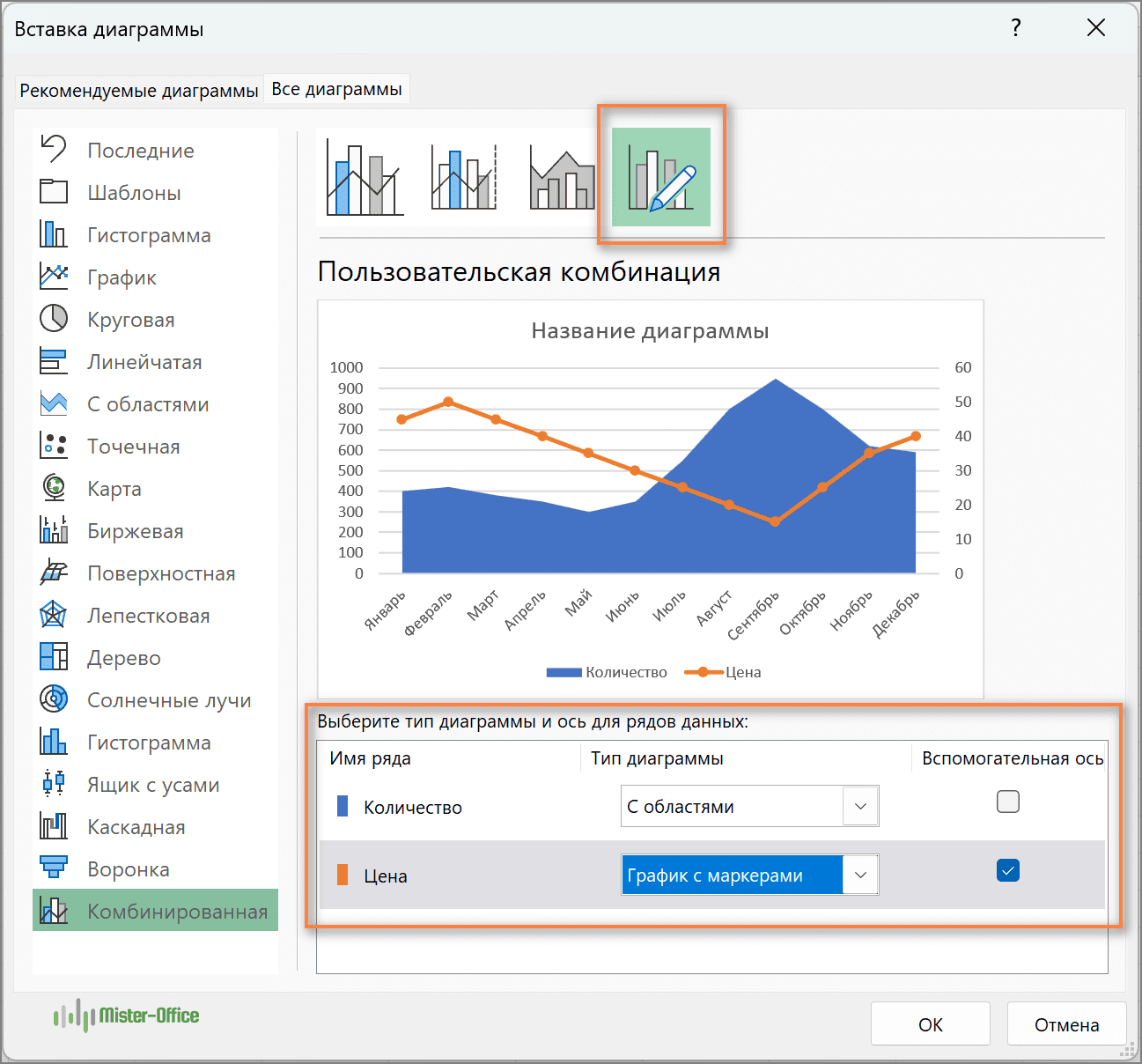 Если вас не устраивает какой-либо из предварительно подготовленных комбинированных графиков, выберите тип Пользовательская комбинация (последняя иконка со значком пера) и подберите подходящий тип диаграммы отдельно для каждого ряда данных.