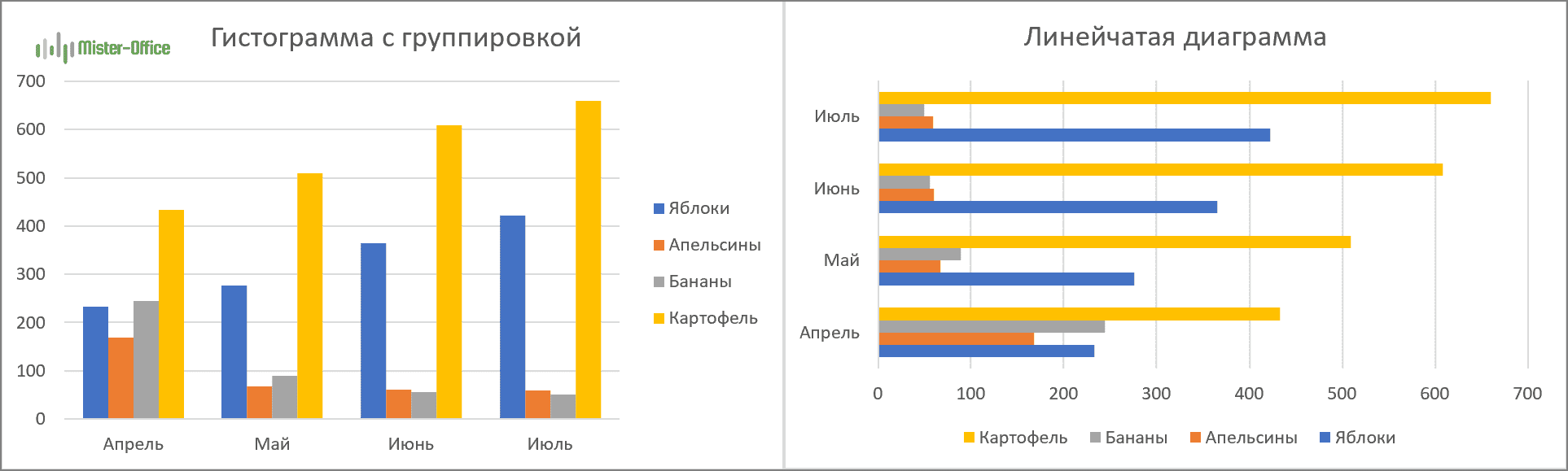 Одна из самых популярных диаграмм используется в презентациях и информационных панелях, столбчатые диаграммы используются для сравнения значений друг с другом. Наиболее распространенные данные для столбчатых диаграмм – это набор данных, разделенный на категории.