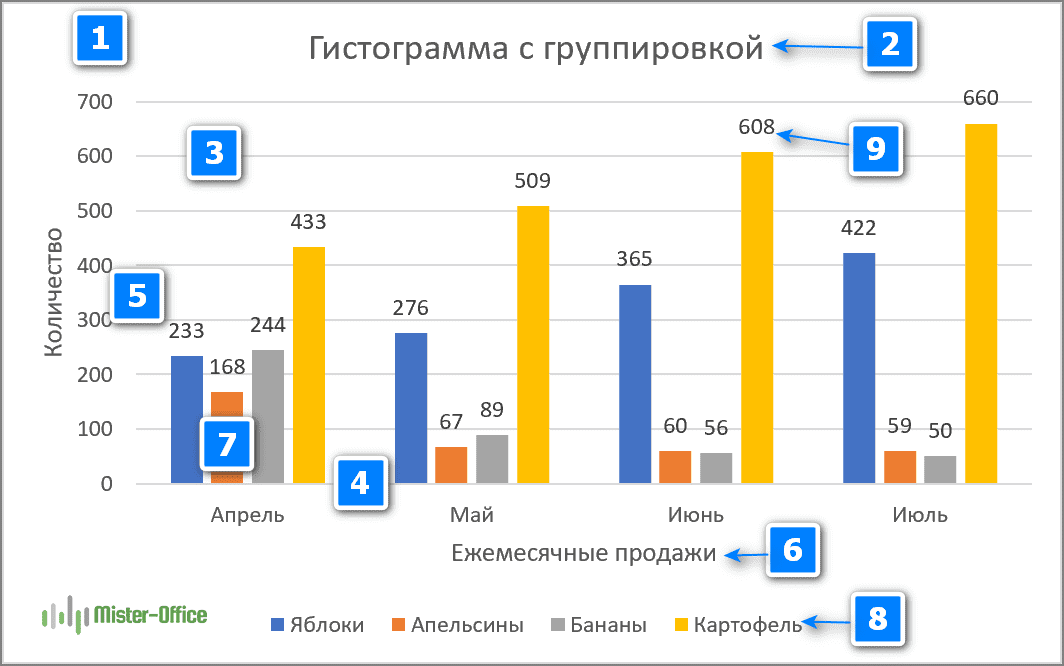 | 1. Область диаграммы2. Название диаграммы3. Область графика4. Горизонтальная ось (категория)5. Вертикальная ось (значение) | 6. Название оси7. Точки данных ряда данных8. Легенда диаграммы9. Метка данных |