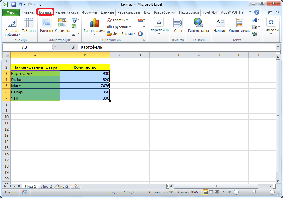 - Когда таблица будет полностью готова, необходимо выделить область, которую требуется отобразить в виде диаграммы, затем перейти во вкладку “Вставка”. Здесь будут представлены для выбора разные типы диаграмм:
