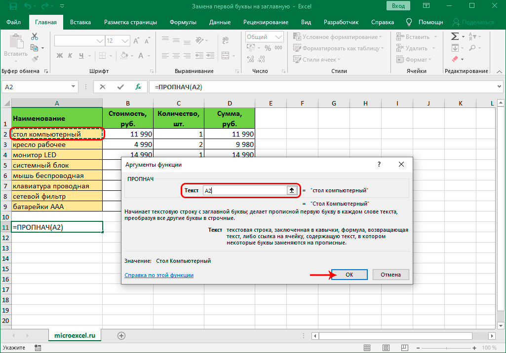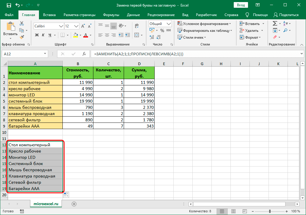 В ячейке B2 введите =ПРОПИСН(A2) и нажмите клавишу «ВВОД». Текст в ячейке B2 должен стать прописным.