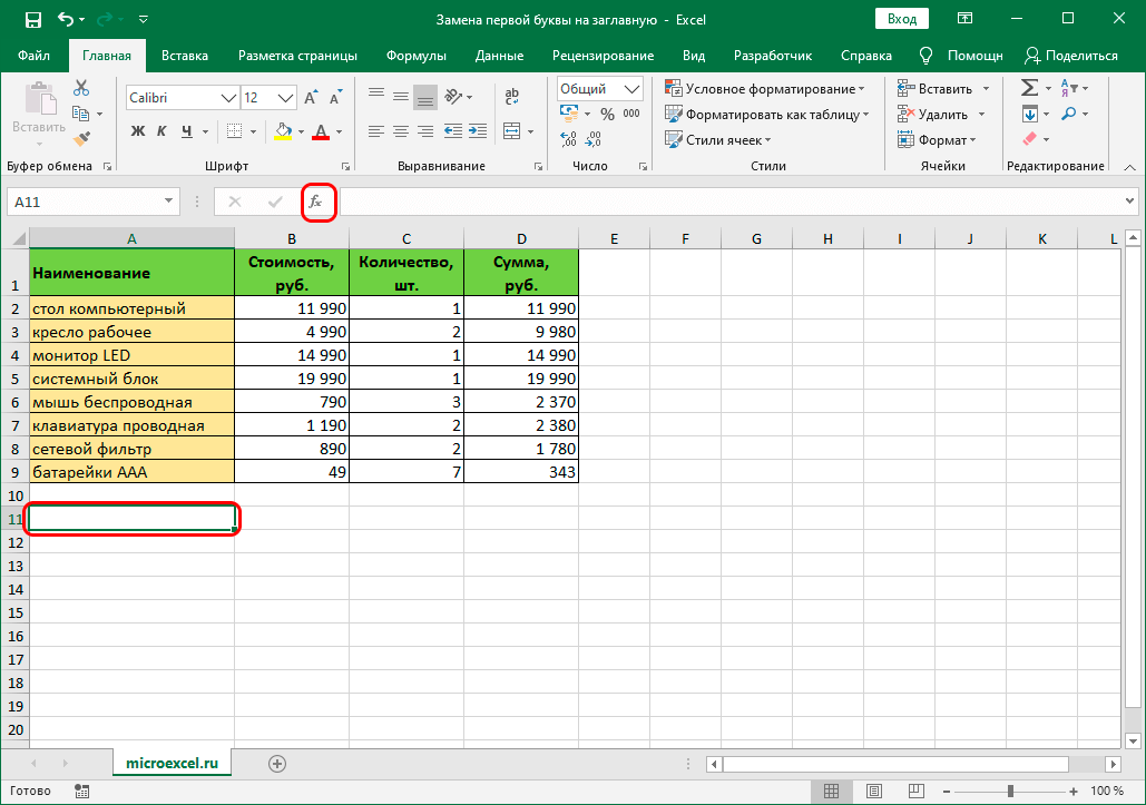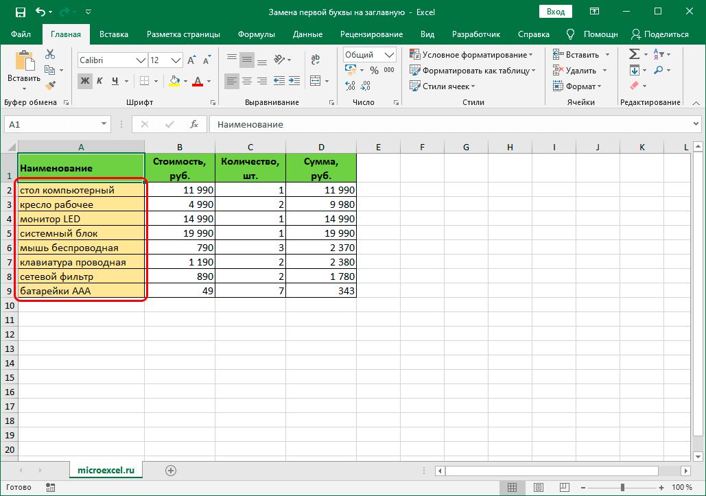 На самом деле, в отличие от выполнения процедуры замены сразу всех строчных букв на заглавные (смотрите, как это это делать в нашей статье – “Как сделать все буквы заглавными в Эксель”), когда речь идет только про первую букву, специально предназначенной для этого отдельной функции в программе нет. Но благодаря одновременному использованию нескольких инструментов справиться с поставленной задаче, все же, можно.